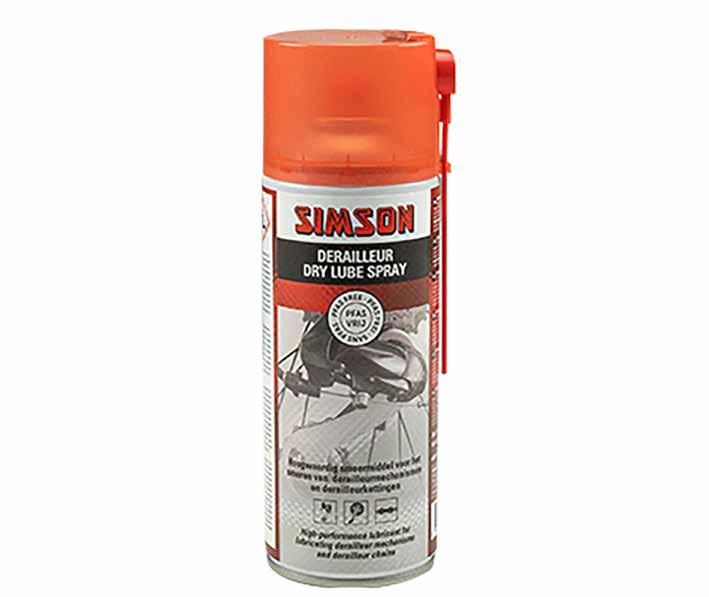 De Simson Derailleur dry lube spray 400ml is een hoogwaardig smeermiddel voor derailleurmechanismen en derailleurkettingen. Zorgt voor een langdurige smering die blijft werken onder zware belasting. Vermindert slijtage doordat de spray de wrijving tussen onderdelen sterk reduceert. Simson Derailleur PTFE spray vormt een dunne smeerlaag, heeft een fijne structuur en een uitstekende hechting. De Simson Derailleur dry lube Spray wordt geleverd in een 400ml spuitbus met een extra rietje om de spray eenvoudig op de gewenste plaats aan te brengen. De ketting eerst schoonmaken en ontvetten met een van de Simson reinigingsmiddelen. Voor gebruik schudden, op het te behandelen onderdeel spuiten en laten inwerken. Na een paar minuten de overtollige olie verwijderen met een schone doek.