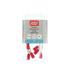 Cosses à oeillet M4 semi-isolées rouge Carpoint 535. Le diamètre intérieur est de 4,3 mm. Convient pour un diamètre de fil de 0,5 à 1,5 mm2. Longueur de la cosse 20 mm. Avec ces cosses, les fils sont serrés sous des têtes de vis. Ces cosses sont conçues pour les conducteurs à brins très fins et généralement utilisées pour des sections transversales plus petites. Livrées par 10 pièces.