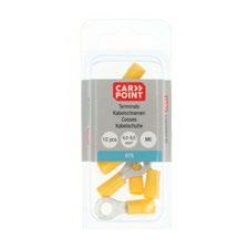 Cosses à oeillet M6 semi-isolées jaune Carpoint 676. Le diamètre intérieur est de 6,4 mm. Convient pour un diamètre de fil de 4,0 à 6,0 mm2. Longueur de la cosse 25 mm. Avec ces cosses, les fils sont serrés sous des têtes de vis. Ces cosses sont conçues pour les conducteurs à brins très fins et généralement utilisées pour des sections transversales plus petites. Livrées par 10 pièces.