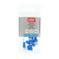 Cosse clip à fourche semi-isolée bleu Carpoint mâle 743. Convient pour un diamètre de fil de 1,5 à 2,5 mm2. Dimensions 4,8 x 0,5 mm. Les connecteurs à fourche mâles sont insérés dans les connecteurs à fourche femelles. Ce type de connecteur se retrouve sur certaines pièces et peut être connecté à des cosses de câble. Livrées par 10 pièces.