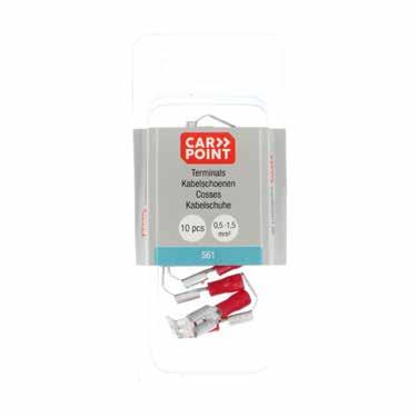 Rode Carpoint deels geïsoleerde Pen kabelschoen 566. De pen heeft een diameter van 1.9mm. Geschikt voor een draaddoorsnede van 0.5-1.5 mm. De kabelschoen heeft een lengte 13mm. Ook penkabelschoenen worden gebruikt voor klemverbindingen. De pinnen zijn echter mechanisch sterker. De afmetingen van de aderdiameter lopen taps toe met de pen, en dus kunnen kleinere klemverbindingen worden bediend via deze kabelschoenen. De pen kabelschoenen worden per 10 stuks geleverd.