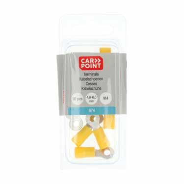 Gele Carpoint deels geïsoleerde M4 ring kabelschoen 674. De diameter van de binnenring is 4.3mm. Geschikt voor een draaddoorsnede van 4.0-6.0 mm2. De kabelschoen heeft een lengte 25 mm. Met deze kabelschoenen worden de draden onder schroefkoppen geklemd. De ringkabelschoenen zijn ontworpen voor zeer fijndradige aders. Ze worden meestal gebruikt voor kleinere doorsneden. De kabelschoenen worden per 10 stuks geleverd.