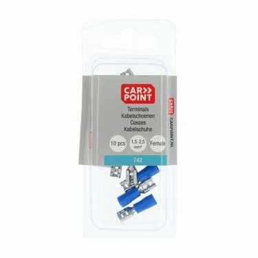 Blauwe Carpoint deels geïsoleerde vlakstekker 743. Vlakstekker kabelschoen is geschikt voor een draaddoorsnede van 1.5–2.5 mm2. De maat van de vlakstekker is 4.8x0.5mm. Vlakstekkers worden in vlakstekkerhulsen gestoken. Deze aansluitingstypen zijn te vinden op bepaalde onderdelen en kunnen met het desbetreffende contrastuk aan kabelschoenen worden aangesloten. De vlakstekkers worden per 10 stuks geleverd.