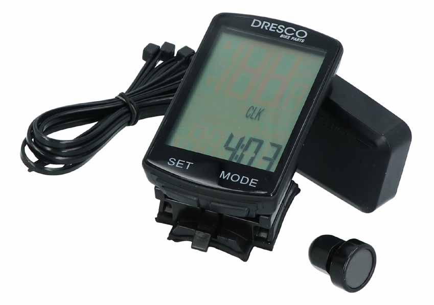 De Dresco draadloze fietscomputer is een computer met maar liefst 19 functies (huidige, gemiddelde en maximum snelheid, 24 uurs klok, rit- en totale afstand, rit duur, calorie en totale calorieverbruik, vetverbranding, huidige, minimale en maximale tempratuur, CO2 vermindering , scanmodus en scanfunctie, stopwatch, achtergrondverlichting en herinnering onderhoud. Met een groot en makkelijk te lezen display van 33x50mm en een dikte van slechts 14,6mm. Door de achtergrond verlichting op de computer zijn alle functies ook in het donker goed leesbaar. De computer kan zonder gereedschap op de fiets gemonteerd worden.