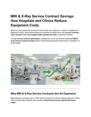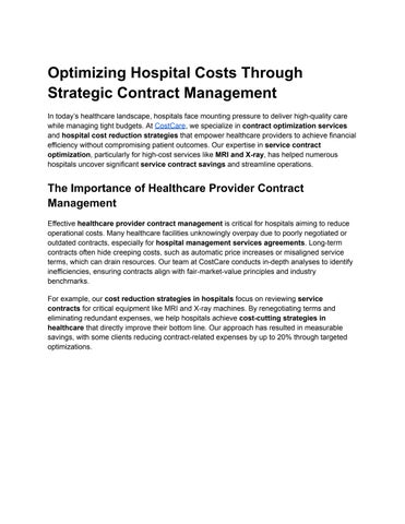 At Contract CostCare, we help hospitals and clinics save money without cutting corners. Our focus is on contract optimization services—reviewing and improving service agreements to make sure you're getting the best value, especially for important medical equipment like MRI and X-ray machines. We believe smarter spending leads to better care. That’s why we offer practical, proven hospital cost reduction strategies and support with healthcare provider contract management. From service contract optimization to identifying hidden fees, our goal is to bring real cost cutting strategies in healthcare that make a difference. Let us help you optimize your contracts, save on services, and put more resources back into what matters most your patients.