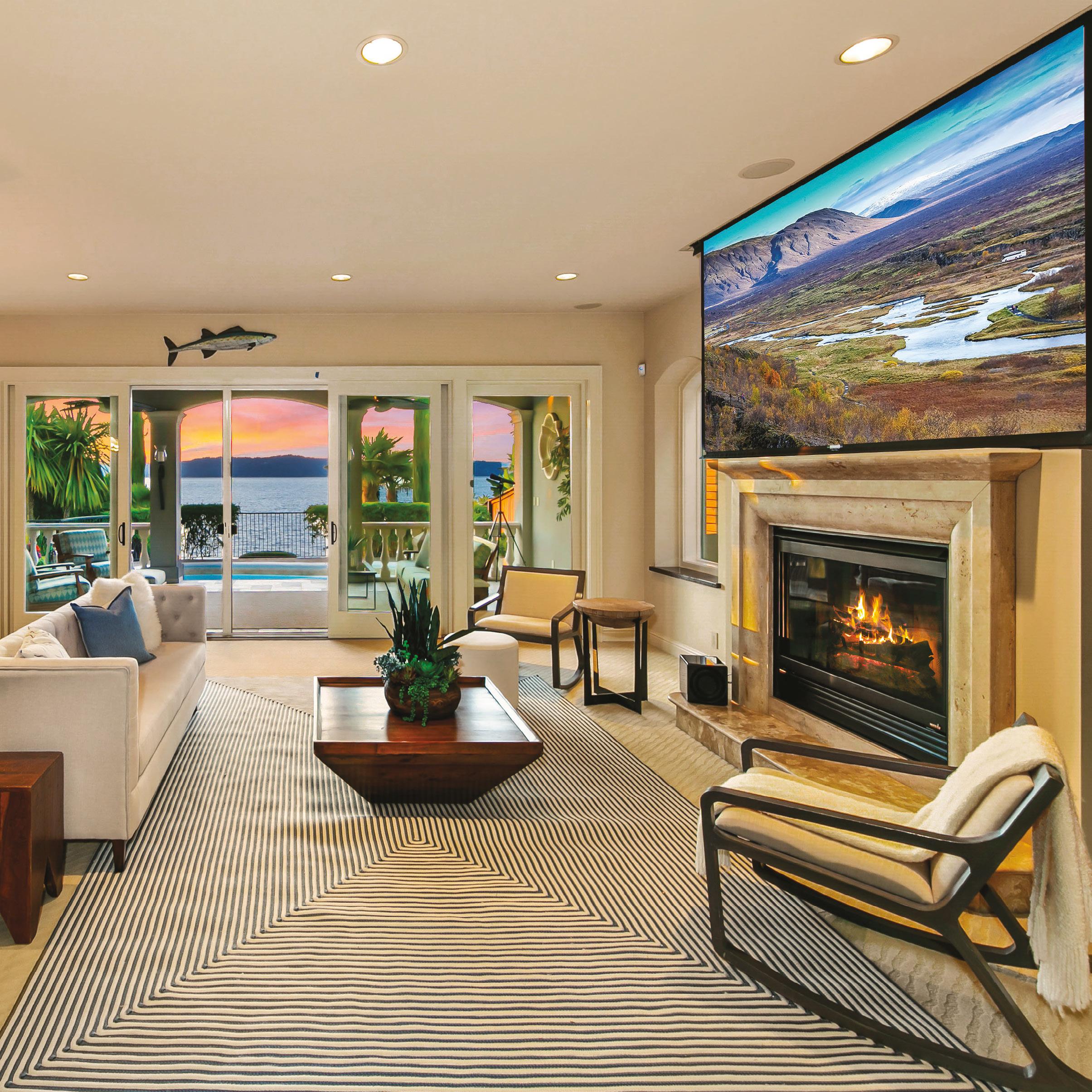 Gas-burning hearth, zoned speaker system, ceiling fans