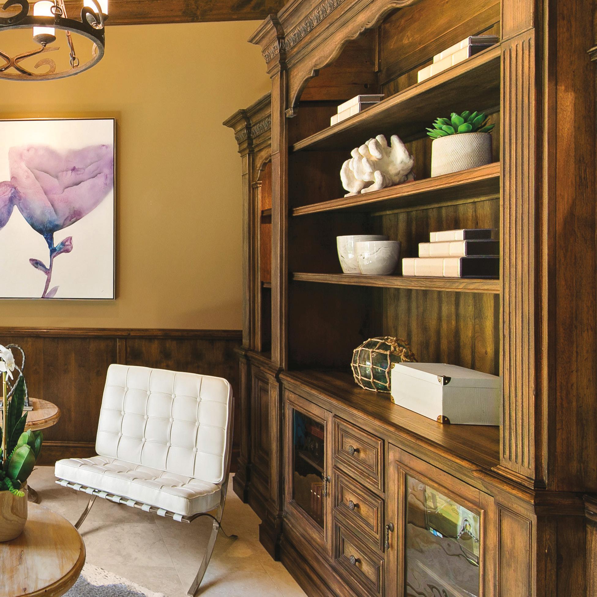 Main-floor library with knotty alder wainscoting and lighted shadowbox