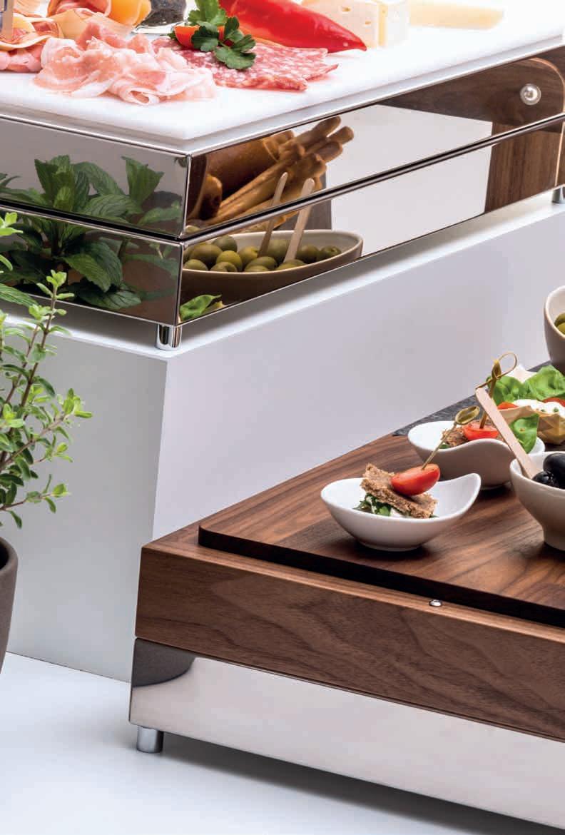Structure composed by two pieces in mirror polished 18/10 stainless steel or a combination of stainless steel and solid walnut wood / chilled with two GN 1/2 ice packs / GN 1/2 inserts available in dark granit, bright granit and walnut wood