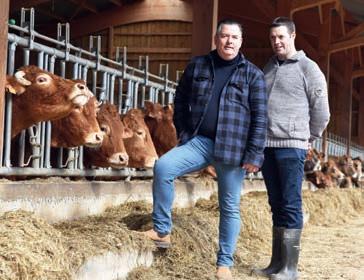Die boerderij is onze volgende stop. We volgen Peter en worden snel overweldigd door het machtige landschap van bossen, weiden, hoeves, kleine dorpen en honderden beekjes die vanuit de heuvels naar de vele valleien stromen. Net bevallen dames staan in ruime, open stallen, imposant en mooi te wezen. Pal achter hen dartelen hun kal es door het verse stro. Deze boerderij is de thuisbasis van Benny Somnel, de verantwoordelijke voor alle boerderijen van de groep. De Kaprijkenaar boert al 18 jaar in Frankrijk en aarzelde