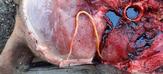 miembros posteriores, en la inspección interna se encontró hidrotórax, pulmones con edema, hemorragias severas en endocardio, estómago, intestino delgado e intestino grueso, enteritis, presencia de heces resecas, bazo con pequeñas zonas inflamadas y congestionadas, además se pudo observar la presencia de Ascaris suum, un parásito intestinal porcino de gran importancia.