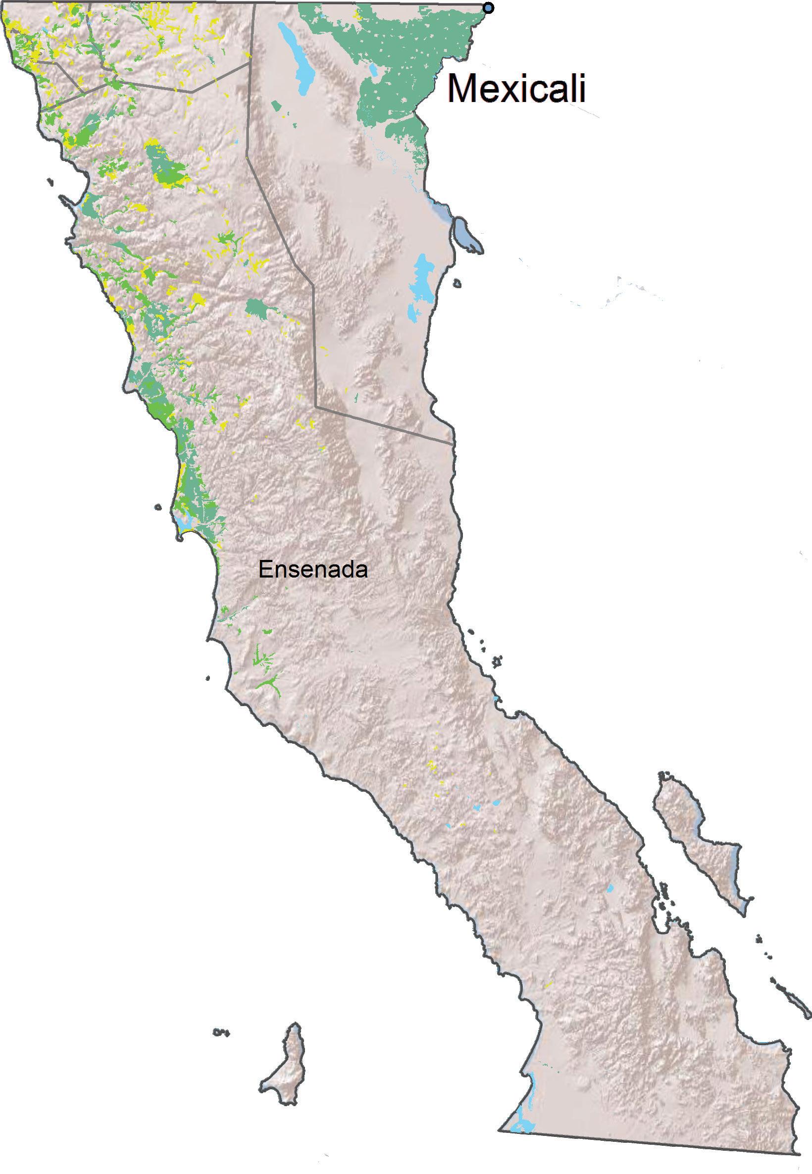 Las sierras de Juárez, San Pedro Mártir, Calamajué, San Borja y Calmalli dividen conforman tres grandes regiones: la occidental, desértica, con lluvias escasas y abundantes nieblas, de clima mediterráneo y poblada por una vegetación de matorral; la centro norte, formada por valles, suelos negros y bosques aislados de pinos y árboles con hojas; y la oriental, estrecha y árida, salvo en el valle de Mexicali, drenado por el Río Colorado. En esta zona se concentra la actividad agrícola, y en la porción septentrional de las dos primeras regiones han prosperado el comercio y el turismo.