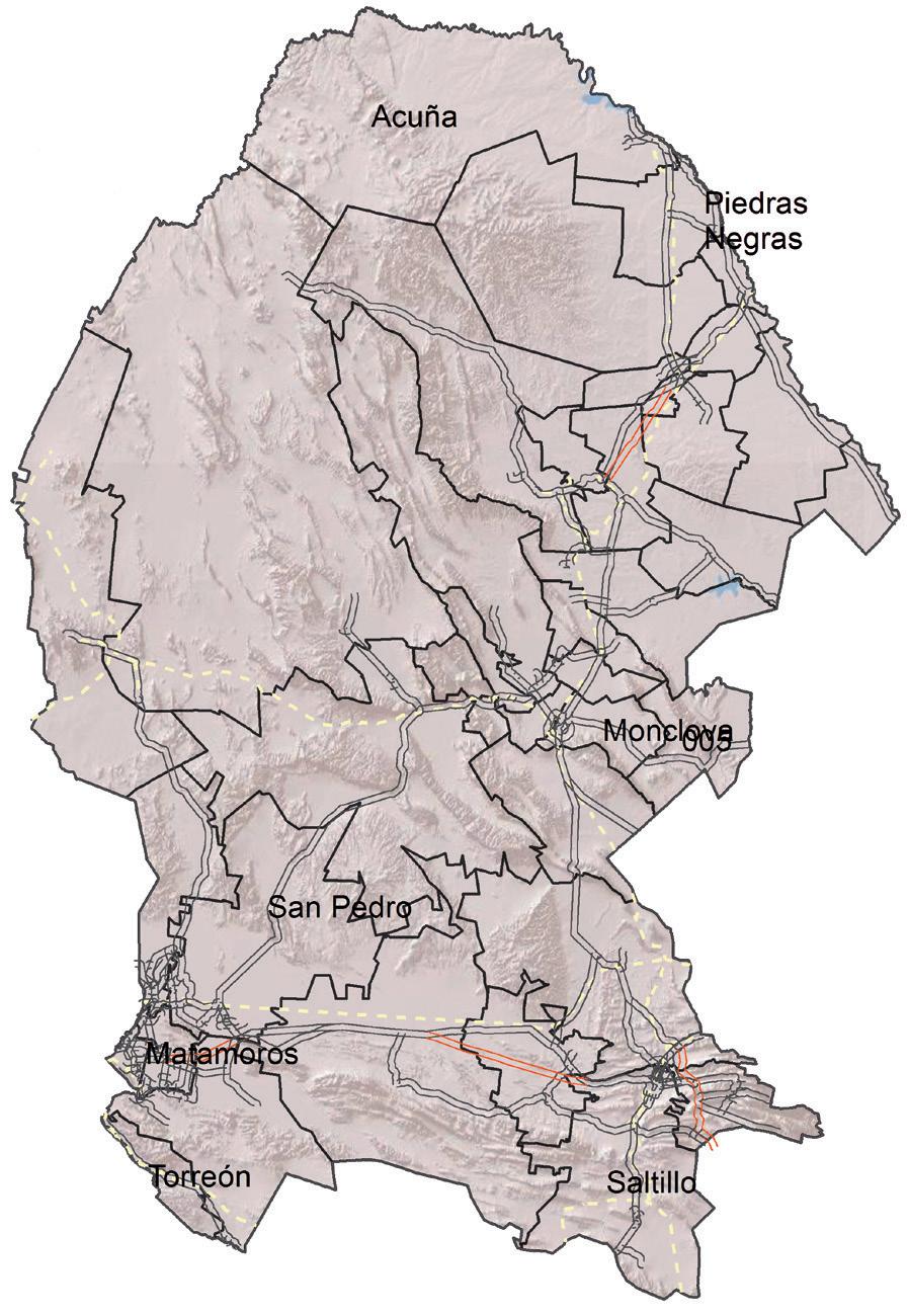 La entidad está formada por 38 municipios, en los que están comprendidas 4,910 localidades (sólo 45 son mayores a 2,500 habitantes). En la delegación Coahuila se encuentran comprendidos 33 municipios y en la delegación Laguna los 5 restantes.