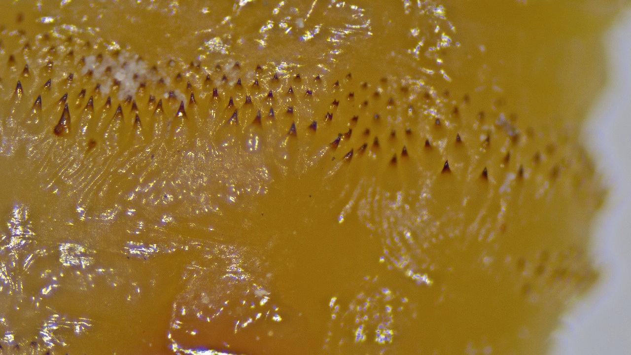 En el primer segmento tiene un par de antenas, un par de palpos sensoriales y un esqueleto cefalofaríngeo bilobulado que podría considerarse como su “cabeza”, el cual posee dos ganchos orales que utiliza para desgarrar los tejidos y poder alimentarse de los fluidos de la sangre y de células vivas del tejido cortado.