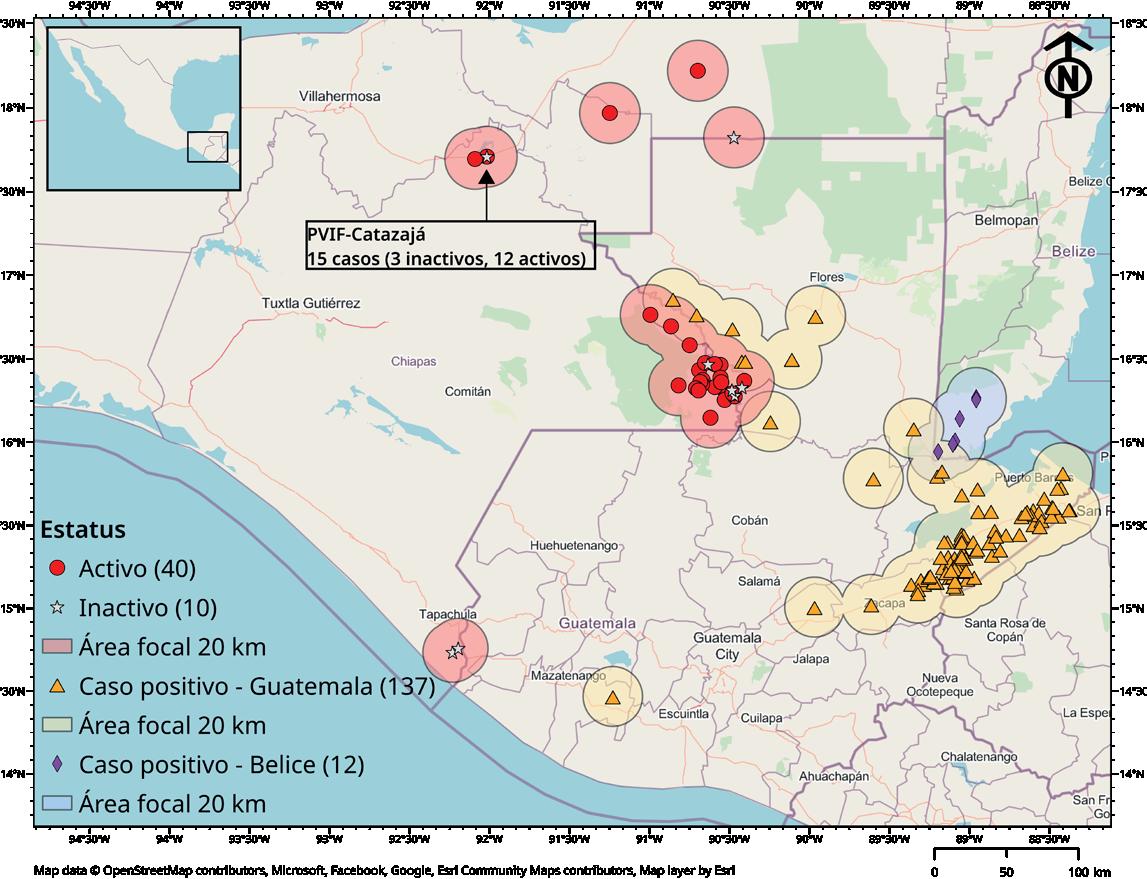47 casos se han detectado en el estado de Chiapas, 17 en el municipio de Benemérito de las Américas, 16 en Catazajá, 09 en Marqués de Comillas, 02 en Frontera Hidalgo y 03 en Ocosingo; asimismo, se han detectado 02 casos en el municipio de Candelaria, estado de Campeche y uno solo en Balancán, estado de Tabasco. semana epidemiológica
