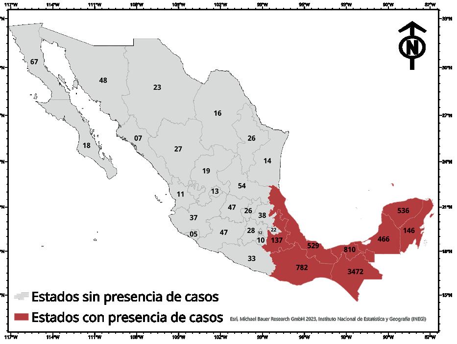 Se han detectado 3,474 casos en el estado de Chiapas, concentrándose principalmente en los municipios de Ocosingo (314), Benemérito de las Américas (212), Tonalá (198), Pijijiapan (169) y Tapachula (184). En el estado de Tabasco, se han registrado 845 casos, de los cuales 443 corresponden al municipio de Balancán, 97 en Huimanguillo y 54 en Tacotalpa, principalmente. En Oaxaca se han registrado 744 casos, siendo Tapanatepec (112) y Chimalapa (104) los más afectados. En Campeche se han confirmado 480 casos, siendo Candela-