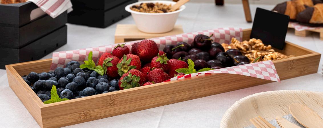 La línea durable de productos “Bamboo” se compone de cuencos, platos, recipientes para aperitivos, tablas, bandejas y una amplia variedad de utensilios de presentación. Estos artículos están diseñados para ser utilizados una y otra vez, garantizando una larga vida útil. Además, el bambú es un recurso totalmente renovable y sostenible, ideal para quienes buscan productos ecológicos sin sacrificar estilo ni funcionalidad.