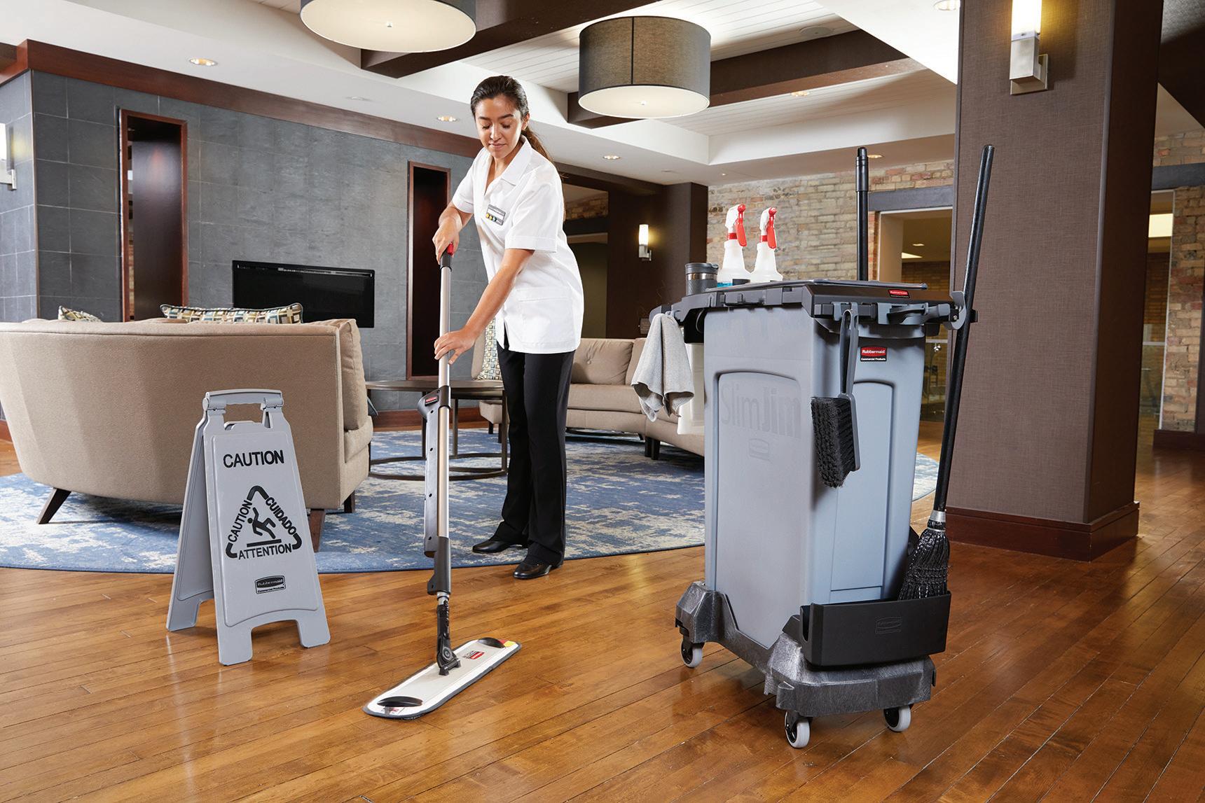 Presenta soluciones diseñadas específicamente para almacenar y transportar herramientas de limpieza común como escobas, recogedores, señales de seguridad, botellas de aspersión y bolsas.