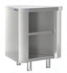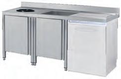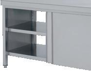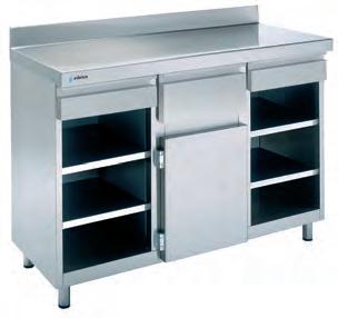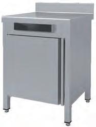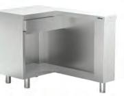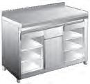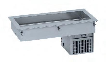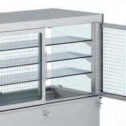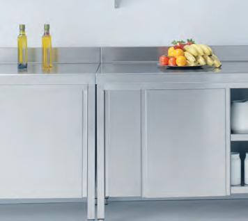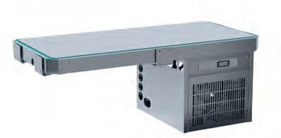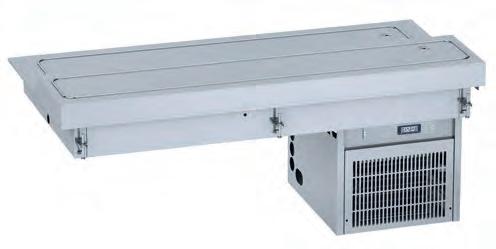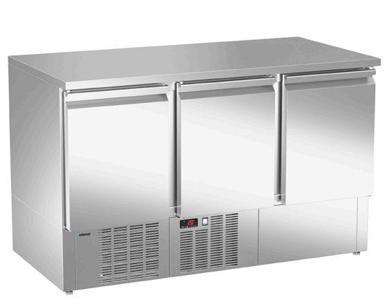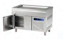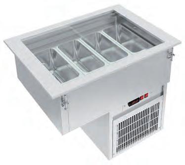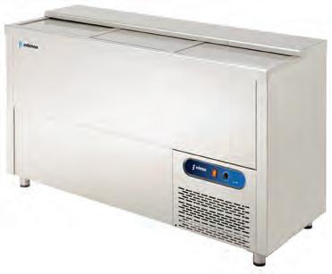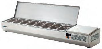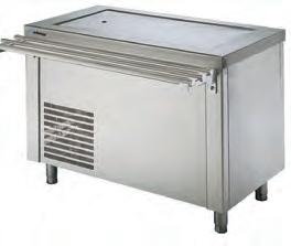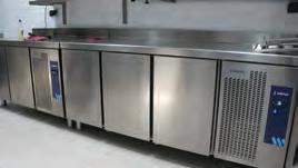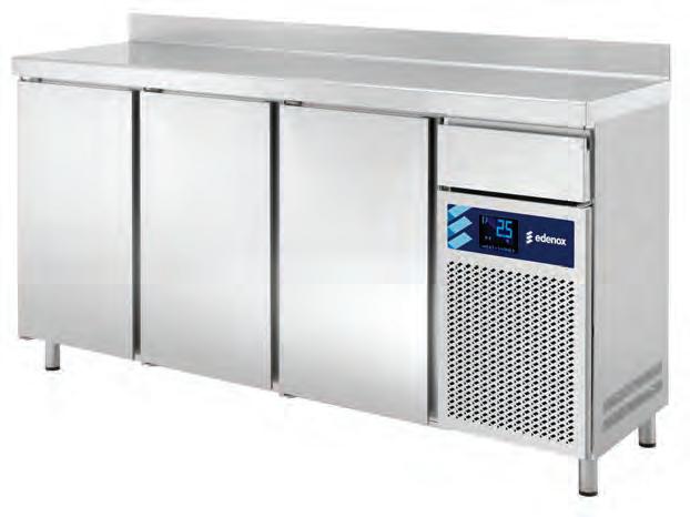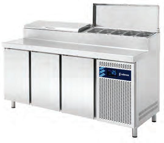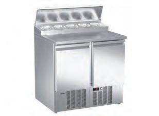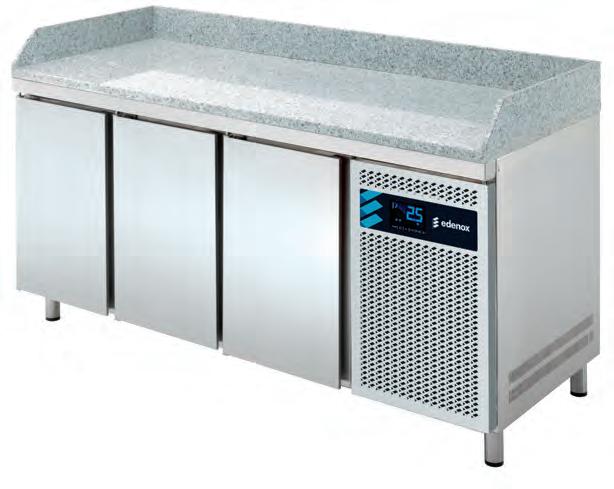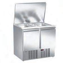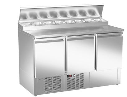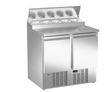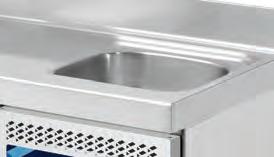 Mesas refrigeradas para preparación de ensaladas y pizzas Serie GN 1/1 –Compactas 0° a +8° C Fabricado especialmente en acero inoxidable de alta calidad para aplicaciones profesionales intensivas, con un diseño muy robusto y un acabado perfecto. Encimera de trabajo de acero inoxidable de 30 mm, inyectada con poliuretano libre de CFC, sin peto.