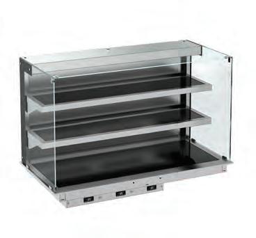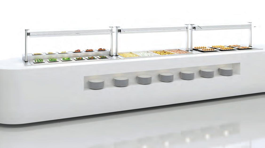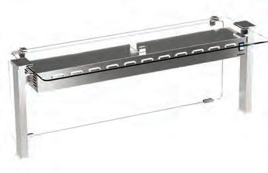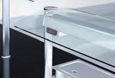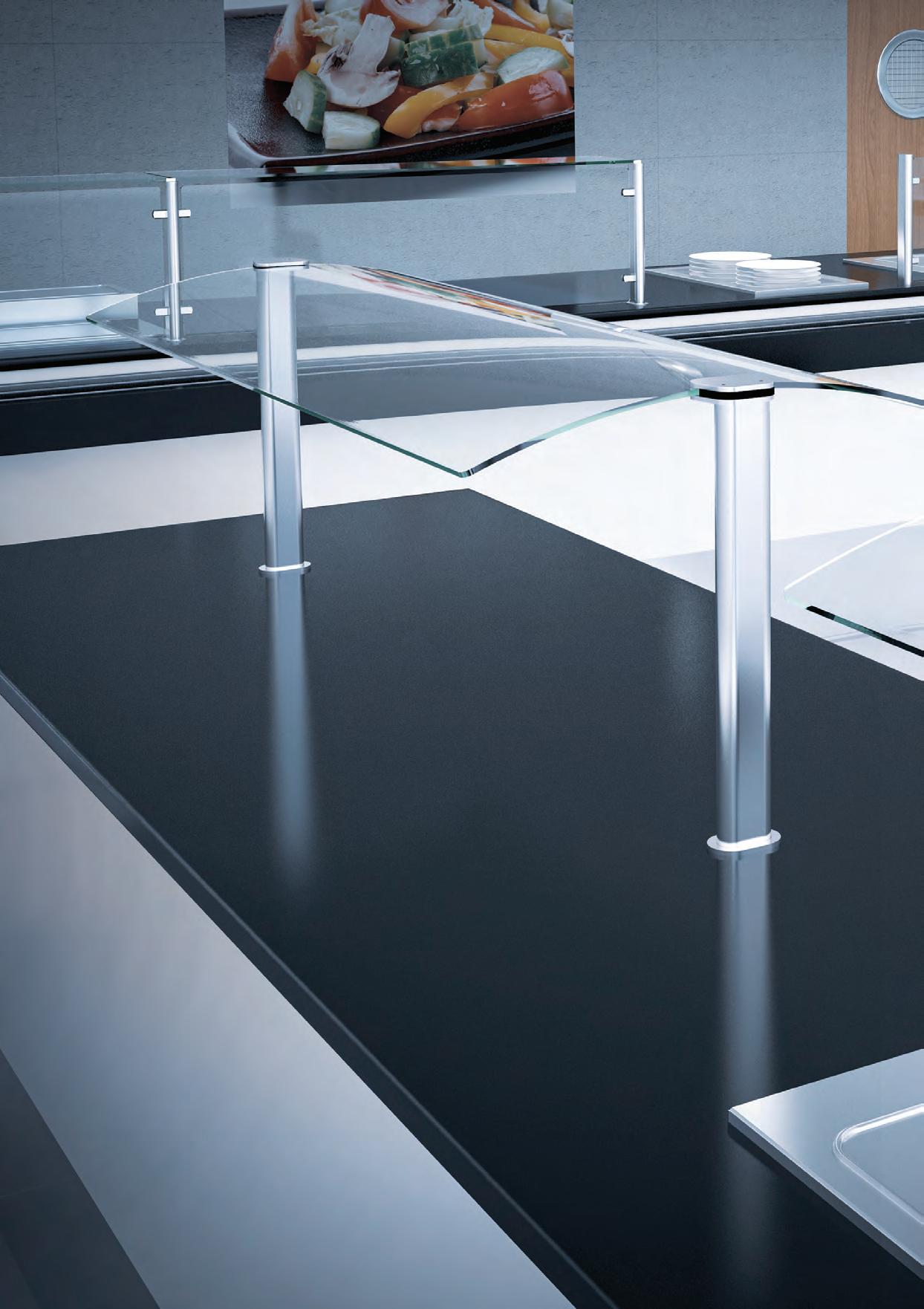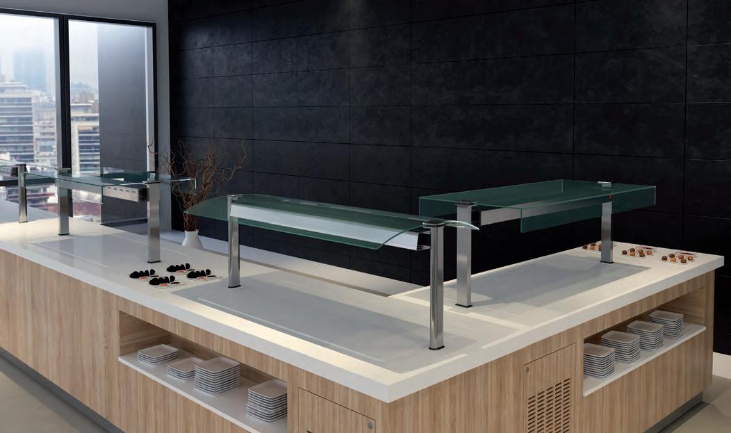 Pantallas y cristales inclinados para proteger, realzar e iluminar los productos. Equipadas con iluminación LED, ideales para instalaciones donde no se incluya un elemento Drop-in. Pantallas con luz y calor para mantener los productos calientes. Diseñadas para proteger, iluminar y mantener los alimentos calientes mediante el uso de halógenos protegidos que combinan luz y calor.