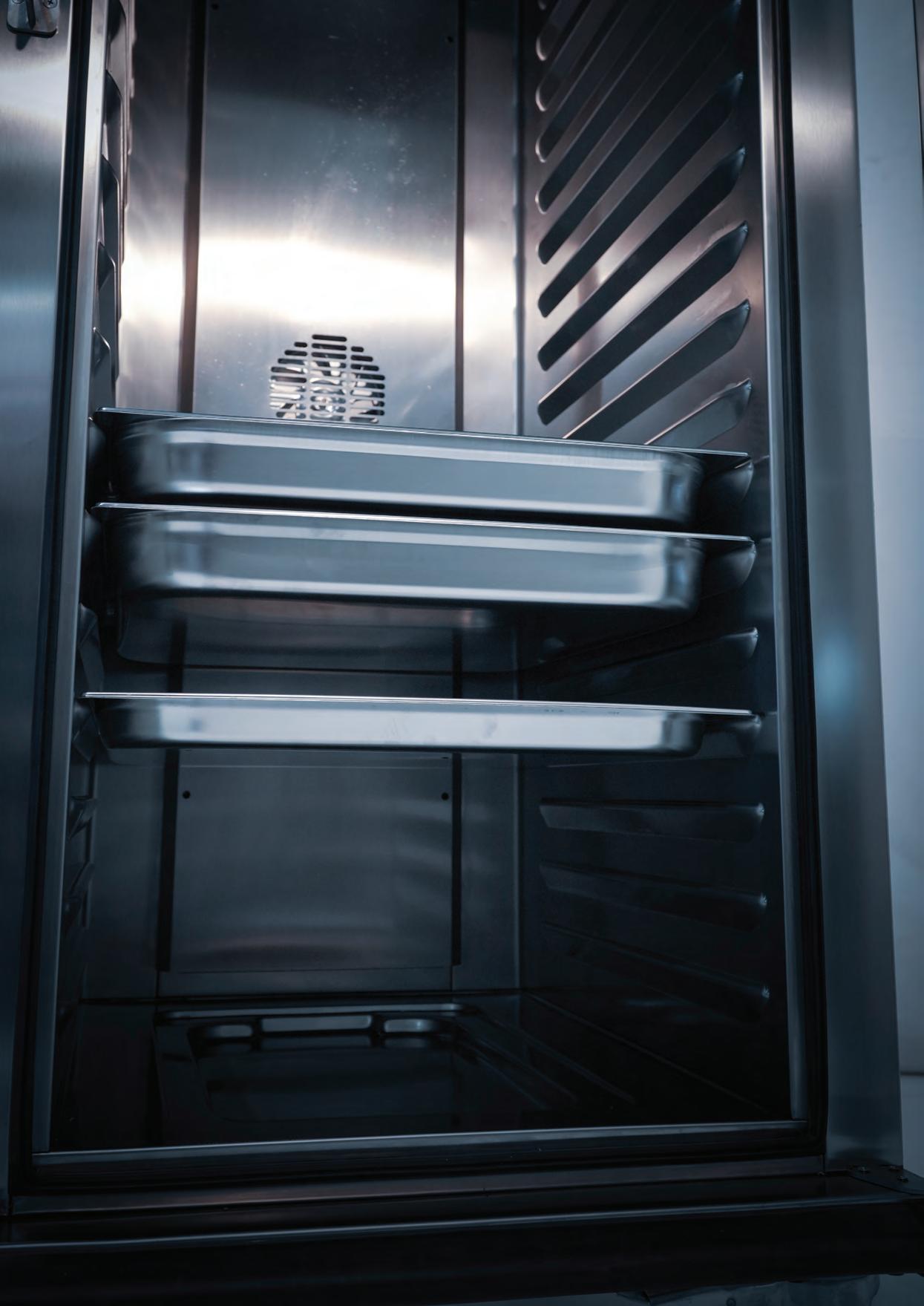 Abatidores-congeladores rápidos controlados electrónicamente. Ciclos medidos según norma EN17032. Ciclo abatimiento: +65°C a +10°C en 120 minutos. Ciclo congelación: +65°C a -18°C en 270 minutos.Interior fabricado en acero inoxidable. Gas-refrigerante ecológico R-290 libre de CFC.