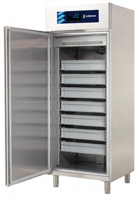 Los armarios refrigerados de Edenox, con su nuevo diseño, incorporan un nuevo termostato de gran formato con alarma visual y sonora de puerta abierta. Gracias a la incorporación de guías embutidas, el interior ha sido completamente renovado y ahora cuenta con un aislamiento de 60 mm de espesor, lo que mejora tanto la eficiencia energética como la higiene