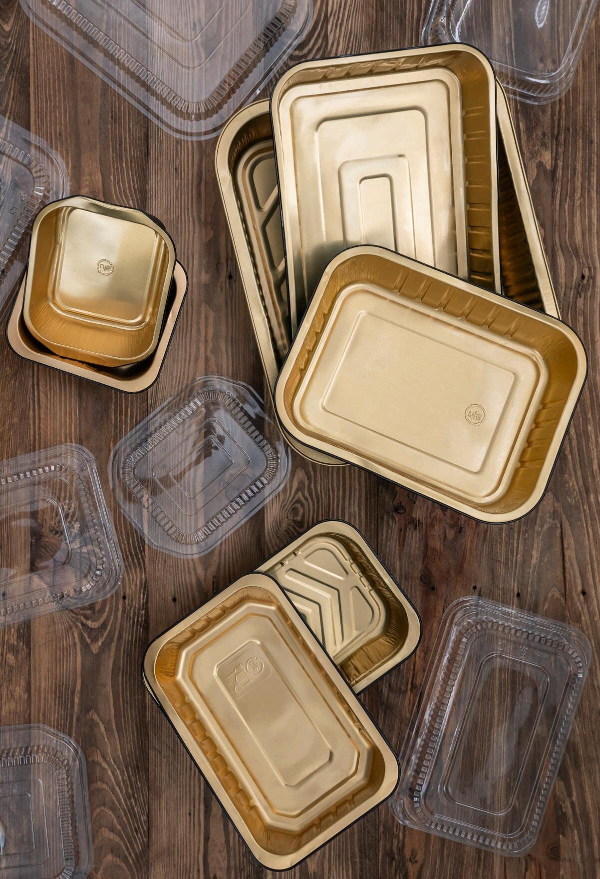 This range of coloured aluminium containers are perfect for snacks, desserts, sauces, dressings, sweet treats and much more. Thanks to a transparent lid offering added protection, they are easy to transport and maintain the food temperature. They can be heated in convection ovens, microwaves, air fryer ovens and steam ovens. We also have aluminium products specially designed for rotisseries, patisseries and, in general, all types of ready-made food for takeaway or delivery.