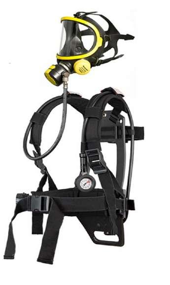 Equipo de respiración con pitido de alarma que indica el fin del funcionamiento integrada en el manómetro, punto de fijación para línea de vida, placa posterior flexible, ergonómica y no metálica, y arnés lavable.