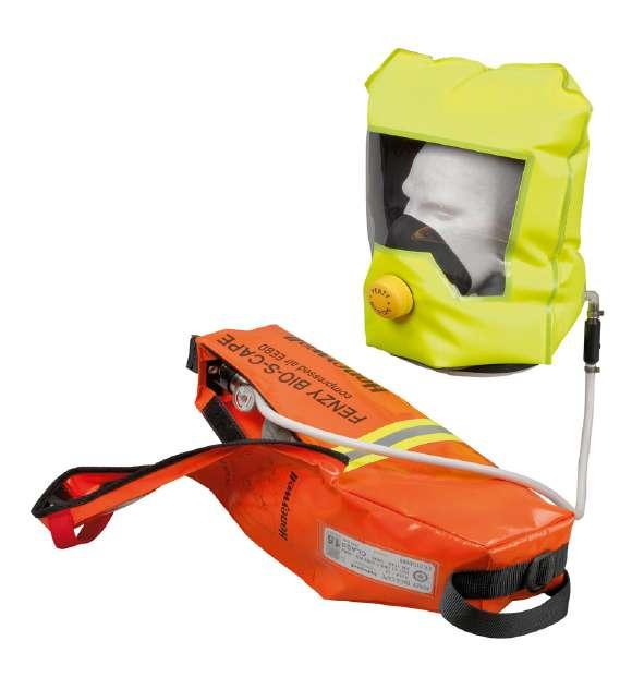 Equipo de respiración de emergencia de aire comprimido, diseñado para proporcionar una fácil colocación y óptima protección respiratoria. El equipo está contenido en una bolsa de transporte, que al abrirse, activa automáticamente el suministro de aire respirable desde la botella.