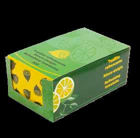 Impregnadas com água, álcool e fragrâncias de limão, chá verde ou aloé vera. Apresentam-se numa caixa dispensadora.