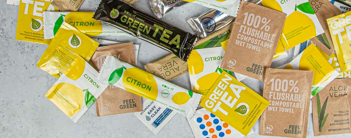 We offer versatile hand wipes for hospitality: refreshing scents, soluble flushables to eliminate the smell of food on hands and hydroalcoholic. Available in standard format and Roll - it. We also offer stain removing and citronella anti mosquito wipes.