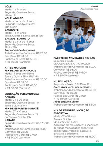 VÔLEI Idade: 11 a 14 anos Segunda, Quarta e Sexta: 14h às 15h VÔLEI ADULTO Idade: a partir de 19 anos Segunda, Quarta e Sexta: 20h às 21h BASQUETE Idade: 11 a 14 anos Terça, Quinta e Sexta: 15h às 16h BASQUETE ADULTO Idade: a partir de 19 anos Segunda, Quarta e Sexta: 21h às 22h Preço (Vôlei e Basquete) Trabalhador do Comércio: R$ 20,00 Convênio: R$ 34,00 Público em Geral: R$ 50,00 + R$ 30,00 (Carteira) ARTES MARCIAIS MIX DE ARTES MARCIAIS Idade: 13 anos em diante Terça e Quinta: 16h/ 17h/ 18h Trabalhador do Comércio: R$ 20,00 Convênio: R$ 34,00 Público em Geral: R$ 48,00 + R$ 30,00 (Carteira) EDUCAÇÃO PSICOMOTORA KARATÊ Idade: 04 a 06 anos Segunda, Quarta e Sexta: 14h Terça e Quinta: 14h MIX DE ESPORTES KARATÊ Idade: 07 a 10 anos Segunda, Quarta e Sexta: 15h ou Terça e Quinta: 15h KARATÊ Segunda, Quarta e Sexta: 16h/17h/18h Preço Trabalhador do Comércio: R$ 15,00 Convênio: R$ 25,00 Público em Geral: R$ 37,00 + R$ 30,00 (carteira)