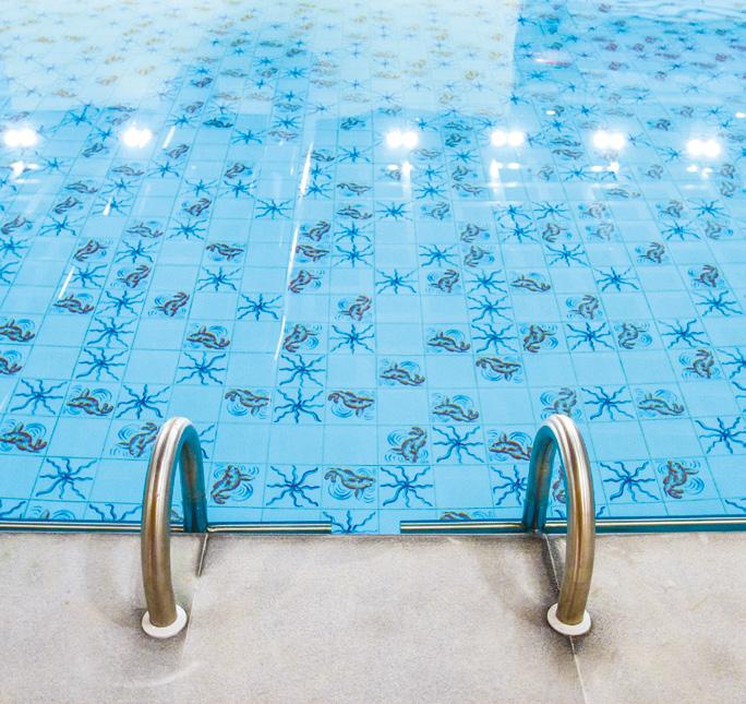 mais popular, Gerchman escolheu motivos da cultura brasileira (folhas de bananeira na cozinha, e estrelasdo-mar e peixes-porquinho na área aquática) para decorar as peças de cerâmica que foram assentadas de modo livre pelos operários durante a obra, misturando-as com azulejos brancos. Após passarem anos submersos, os desenhos da piscina foram restaurados, assim como todo o