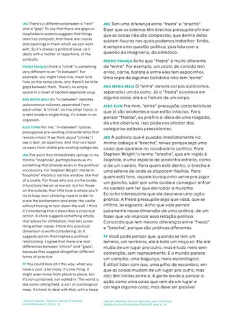 JRG Tem uma diferença entre “fresta” e “brecha”. Dizer que os sistemas têm brechas pressupõe afirmar que as coisas não são compactas, que dentro delas existem fissuras nas quais podemos trabalhar. Então, é sempre uma questão política, pois lida com a questão do imaginário, do simbólico. PEDRO FRANÇA Acho que “fresta” é muito diferente de “entre”. Por exemplo, um prato de comida tem arroz, carne, batata e entre eles tem espacinhos. Uma sopa de legumes batidona não tem “entre”. ANA MARIA MAIA O “entre” denota corpos autônomos, separados um do outro. Já a “fresta” acontece em alguma coisa, ela é a fratura de um corpo. ALEX FLYN Pra mim, “entre” pressupõe características que já são existentes e que estão intactas. Para pensar “frestas”, eu prefiro a ideia de uma rasgada, de uma abertura. Isso pode nos afastar das categorias estáveis preexistentes. JRG A palavra que é puxada imediatamente na minha cabeça é “brecha”, talvez porque seja uma coisa que aparece no vocabulário político. Para Stephen Wright,1 o termo “brecha”, que em inglês é loophole, é uma espécie de janelinha estreita, como a de um castelo. Para quem está dentro, a brecha é uma seteira de onde se disparam flechas. Para quem está fora, aquele buraquinho serve pra jogar um gancho, subir por uma corda e conseguir entrar no castelo sem ter que derrubar a muralha. Eu acho interessante que ele descreve uma ação prática. A fresta pressupõe algo que vaza, que se infiltra, se esgueira. Acho que vale pensar justamente nessa dimensão de uma prática, de um fazer que vai implicar essa relação política. Concordo que tem mesmo diferenças entre “fresta” e “brecha”, porque são práticas diferentes. PF Você pode pensar que, quando se tem um terreno, um território, ele é todo um troço só. Ele até muda de um lugar pro outro, mas é tudo meio sem contenção, sem represamento. E o mundo parece um campão, uma bagunça, meio escatológico. É difícil lidar com isso, uma pilha de escombro, em que as coisas mudam de um lugar pro outro, mas não têm limites entre si. A gente tende a pensar a ação como uma coisa que vem de um lugar e carrega alguma coisa, mas deve ser possível 1 WRIGHT, Stephen. Para um léxico dos usos. São Paulo: Edições Aurora/Publication Studio SP, 2016. p. 79.