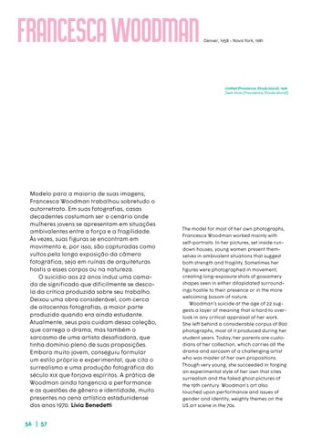 Modelo para a maioria de suas imagens, Francesca Woodman trabalhou sobretudo o autorretrato. Em suas fotografias, casas decadentes costumam ser o cenário onde mulheres jovens se apresentam em situações ambivalentes entre a força e a fragilidade. Às vezes, suas figuras se encontram em movimento e, por isso, são capturadas como vultos pela longa exposição da câmera fotográfica, seja em ruínas de arquiteturas hostis a esses corpos ou na natureza. O suicídio aos 22 anos induz uma camada de significado que dificilmente se descola da crítica produzida sobre seu trabalho. Deixou uma obra considerável, com cerca de oitocentas fotografias, a maior parte produzida quando era ainda estudante. Atualmente, seus pais cuidam dessa coleção, que carrega o drama, mas também o sarcasmo de uma artista desafiadora, que tinha domínio pleno de suas proposições. Embora muito jovem, conseguiu formular um estilo próprio e experimental, que cita o surrealismo e uma produção fotográfica do século XIX que forjava espíritos. A prática de Woodman ainda tangencia a performance e as questões de gênero e identidade, muito presentes na cena artística estadunidense dos anos 1970. Lívia Benedetti