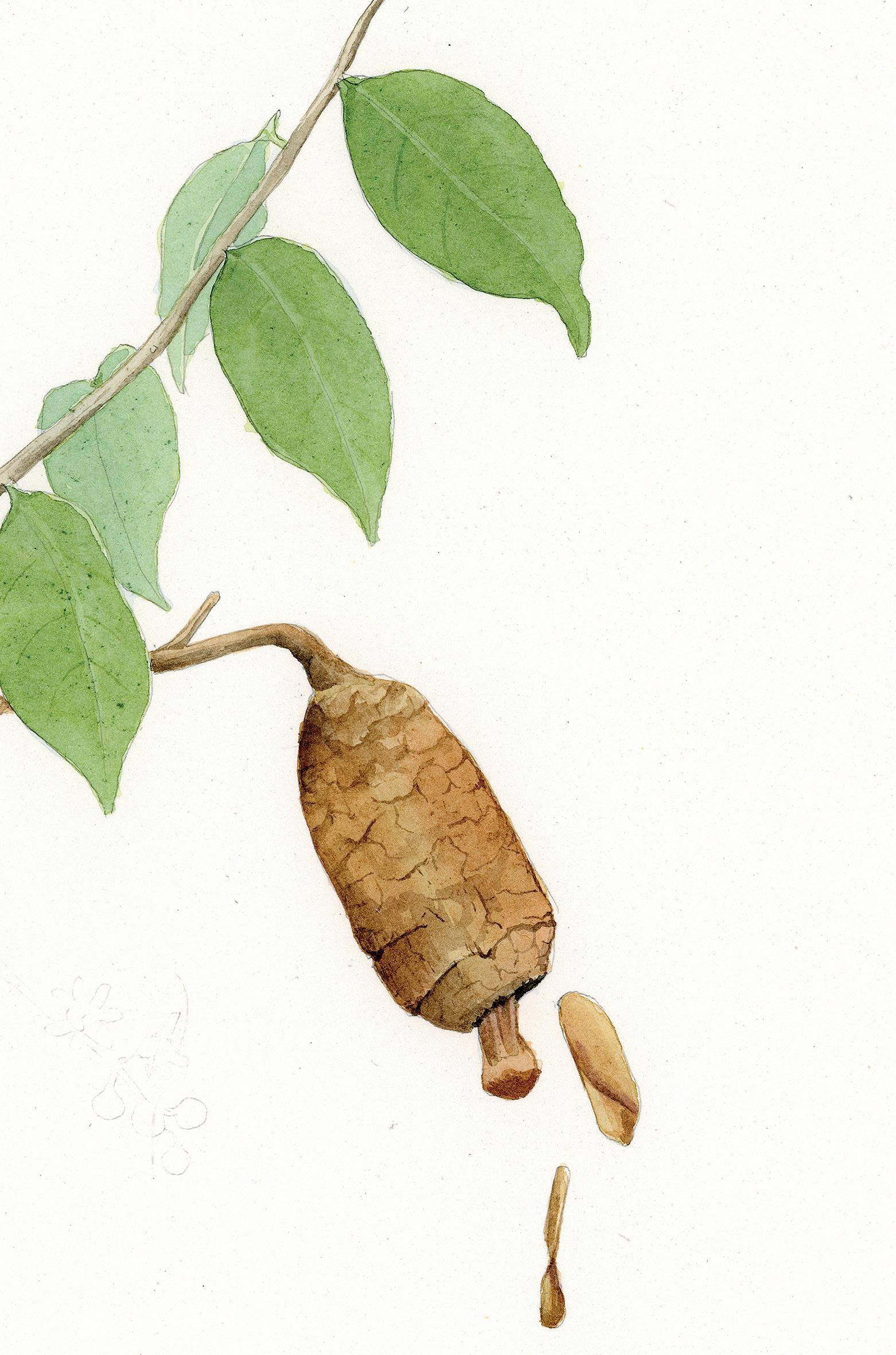 O caule é cilíndrico, ereto, de coloração clara e fissuras profundas na casca. Na parte interna a madeira é corde-rosa. Suas folhas são lisas e lustrosas. É uma planta perenifólia, que mantém a copa com folhas durante todo o ano. Os frutos se abrem para que as sementes, que possuem abas, sejam levadas pelo vento.