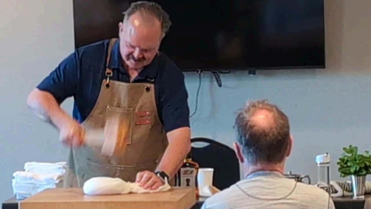 Richard Blanton demostrating how to crush the ice for a proper Mint Julep during the Mint Julep presentaiton