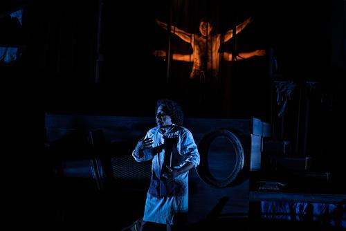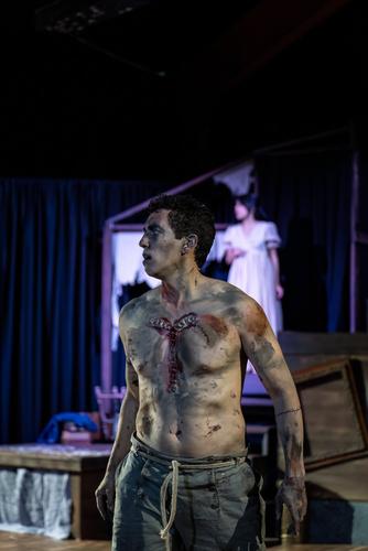the power of creation. Every moment felt intentional; her movement and voice guided the audience through Shelley’s storm of imagination. Through her, Mary became more than a storyteller; she became the pulse of the narrative, a creator wrestling with her own monsters Burrell delivered a commanding dual performance as both Lord Byron and the Creature, the modern Prometheus As Byron, he embodied sharp wit and danger, the fearless provocateur urging Mary to breathe life into her nightmare. When the story shifted into Shelley’s imagined world, his transformation into the Creature was raw and magnetic