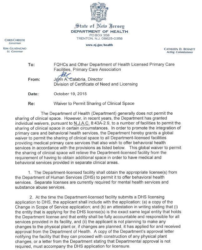 Appendix B: Department of Health Shared Space Waiver, October 19, 2015