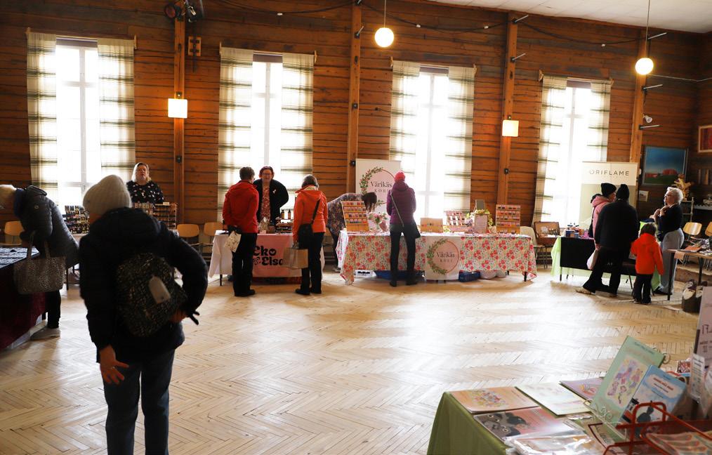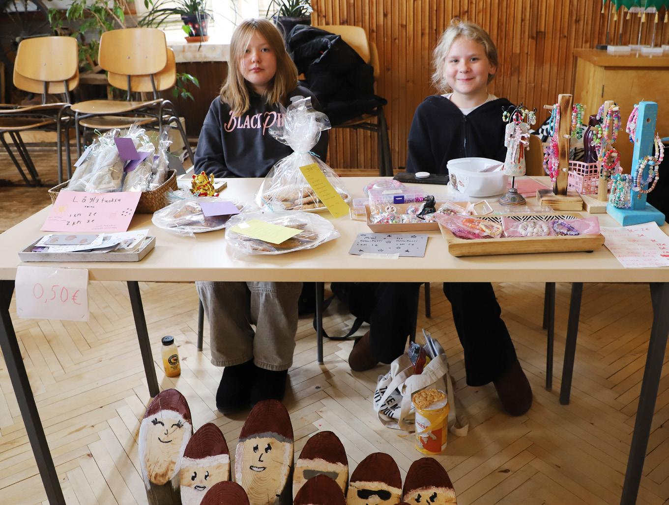 Jutta Keränen ja Isla Leino istuvat pöydän takana, joka on tulvillaan erilaisia käsitöitä: helmikoruja, -rasioita, ja -pusseja, kirjanmerkkejä ja saunatuoksuja. Onpa siinä tarjolla myös maukkaan näköisiä suklaahippukeksejä. Kun katseen suuntaa pöydän alle, pilkottaa sieltä muutaman puusta tehdyn tontun päät. Tuotteitaan kaverukset myyvät naistenmessuilla, jotka pidetään Vihannin nuorisoseurantalolla. Tyttöjen lisäksi salissa omia luomuksiaan myy kymmenkunta muuta myyjää.