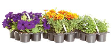 Kesäkukkavalikoimaan kuuluu eri lajikkeita, kuten petuniaa, samettikukkaa ja lobeliaa eri väreissä.