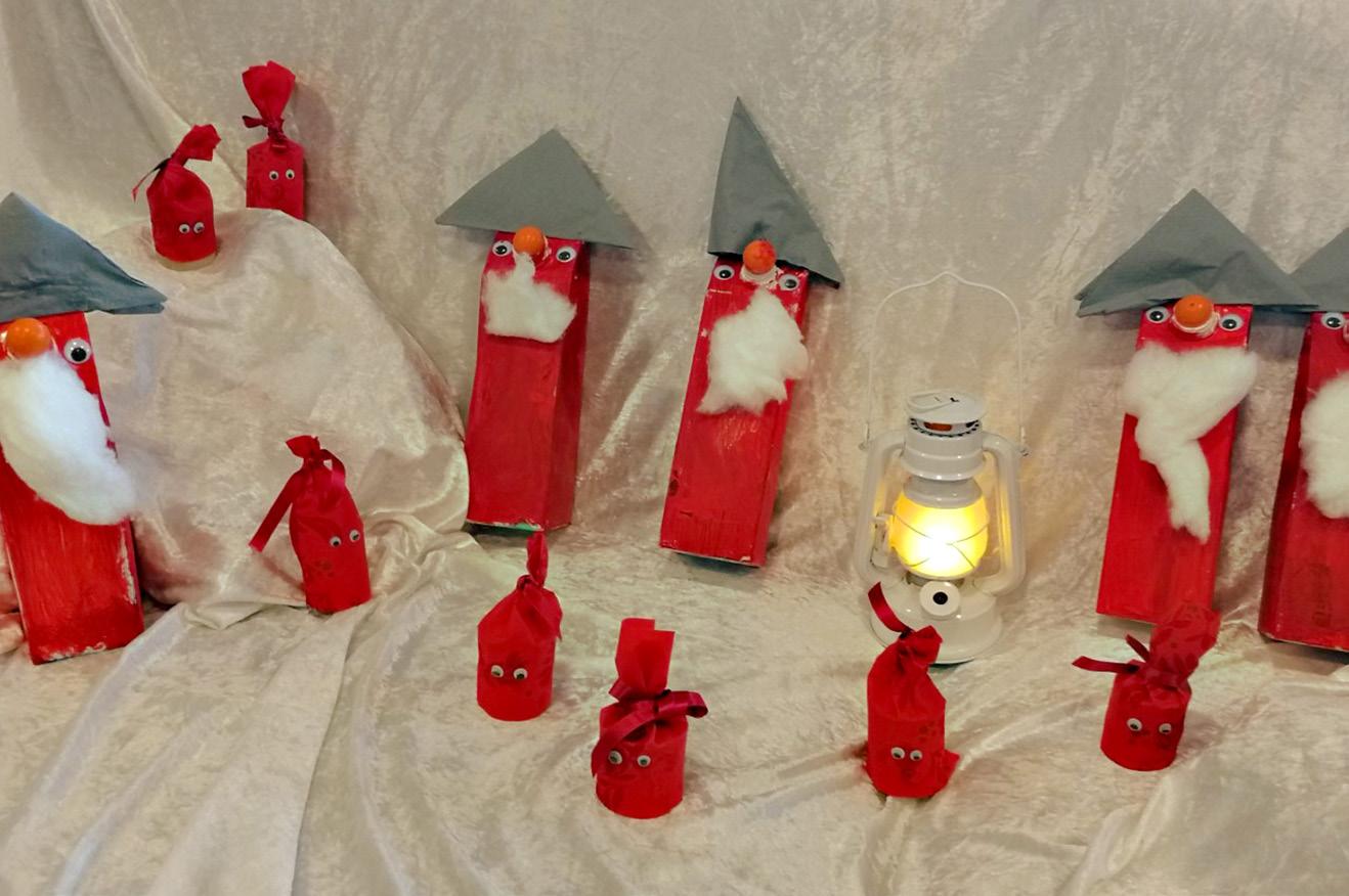 Seurakunnan päiväkerholaiset ja perhekerholaiset tuottivat tunteella ja taidolla jouluisia askarteluita näyttelyä varten. Joulukuuset ja -possut, kynttiläkupit, enkelit ja tontut poroineen, pääsivät muiden ihasteltaviksi. Ohjaajat somistivat tilan, jossa askartelut pääsivät hyvin esille ja valo loisti. Jouluevankeliumissa mainit-