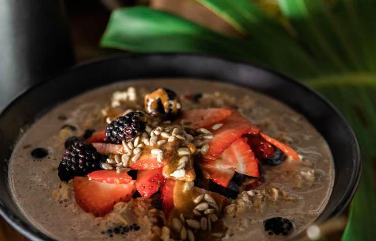 Freshtropicalfruitwithacrunchyoatandalmondcrumble. Servedwithaplantbasedcoldcoconutcustard.