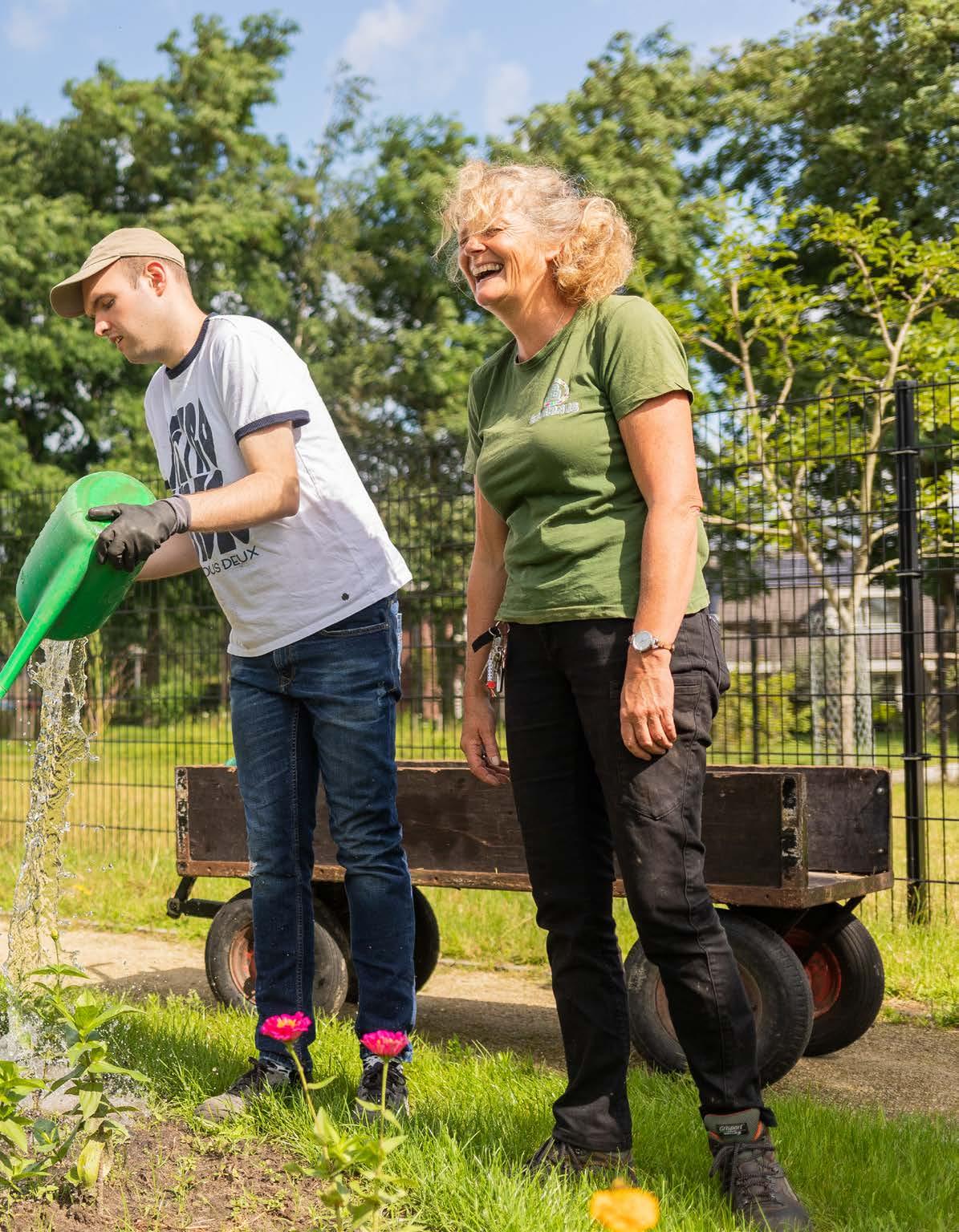 Waterpret op de boerderij Begeleider dagbesteding Judith moet weer lachen, als ze terugdenkt aan Jeroen en z’n gieter. “Jeroen zat in de beleefgroep. Daarin gaat het om genieten van de ervaring van het buitenzijn en van de dieren en de planten. Bovendien helpen cliënten op hun manier mee op de boerderij. In dit geval gaf Jeroen de planten water. Werken met water is fijn, als je de zintuigen wilt prikkelen. Het was zó grappig toen hij die hele gieter omdraaide, in plaats van ermee te schenken.”