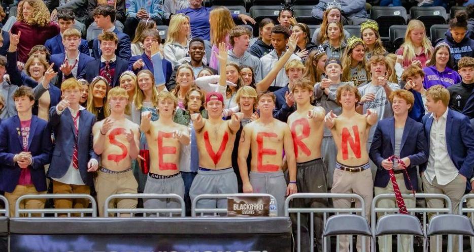 Severn students showed up in a big way to support the Varsity squad at the MIAA B-Conference Basketball Championship game. Sporting coats and ties, crowns and princess dresses, and in some cases no shirts at all, the students were on their feet the whole game, cheering on their classmates as they captured the program’s first Conference Championship in three decades.