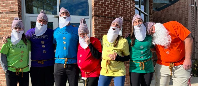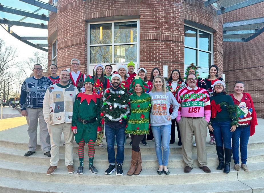 Faculty and staff gathered on the steps of Teel for a group Ugly Sweater photo on the last school day in 2023.