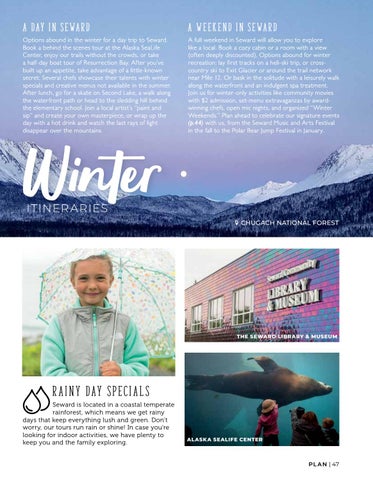 A full weekend in Seward will allow you to explore like a local. Book a cozy cabin or a room with a view (often deeply discounted). Options abound for winter recreation: lay first tracks on a heli-ski trip, or crosscountry ski to Exit Glacier or around the trail network near Mile 12. Or bask in the solitude with a leisurely walk along the waterfront and an indulgent spa treatment. Join us for winter-only activities like community movies with $2 admission, set-menu extravaganzas by awardwinning chefs, open mic nights, and organized “Winter Weekends.” Plan ahead to celebrate our signature events (p.44) with us, from the Seward Music and Arts Festival in the fall to the Polar Bear Jump Festival in January.