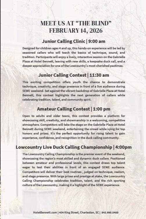 Southeastern Wildlife Exposition P.O. Box 20635 Charleston, SC 29413 (843) 723-1748 | fax (843) 723-4729 sewe.com | sewe@sewe.com