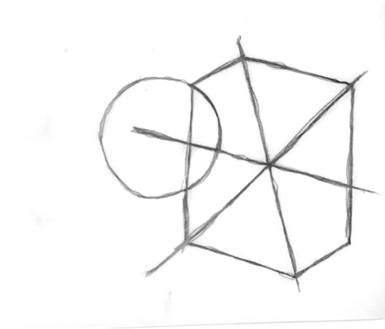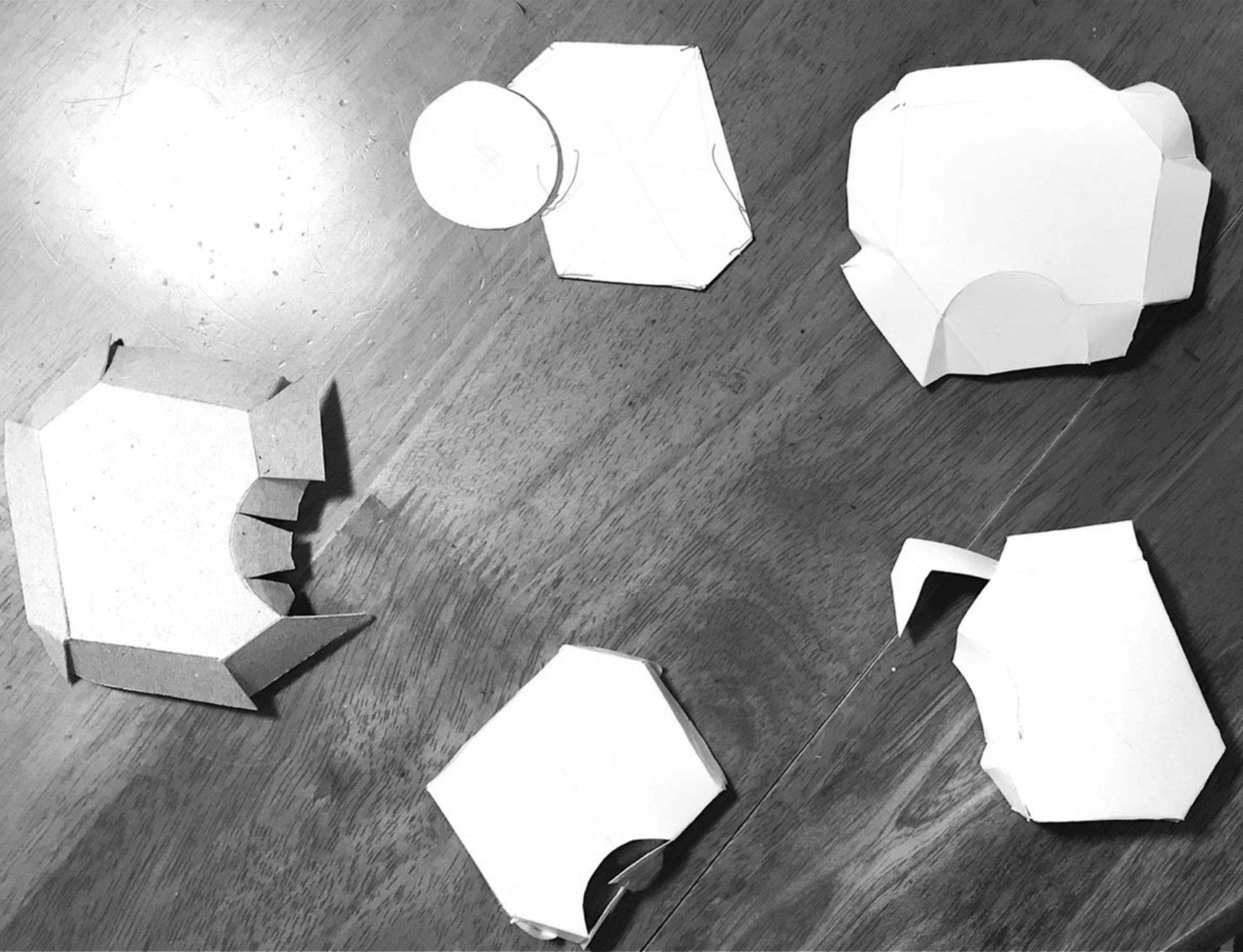 A shape based on a hexagon with a cut-out on one side. Various attempts at a 3D version did not yield success.
