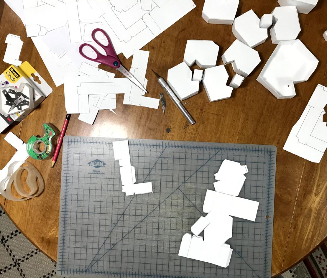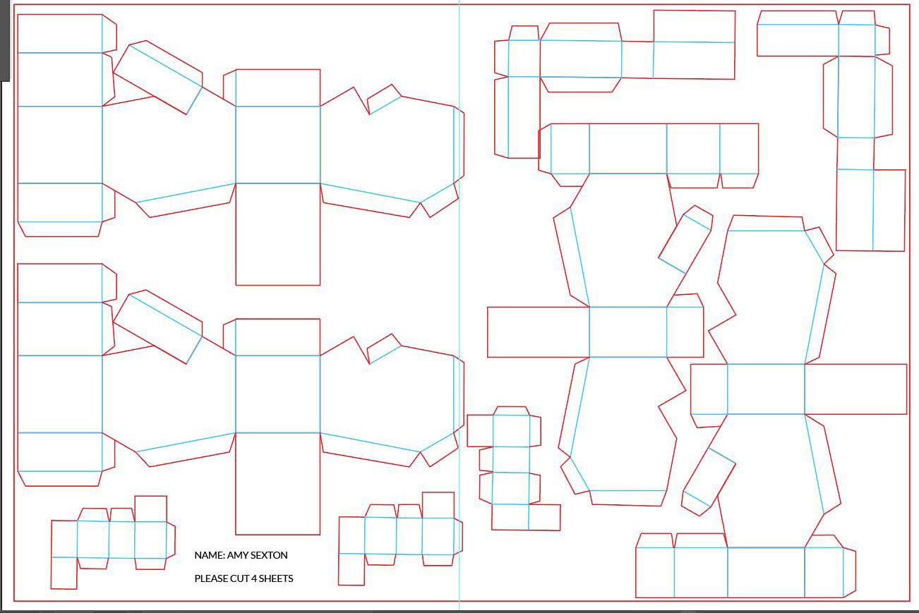 I made a standard version, a taller version of the standard, and a 1.5 scale version. Using tracing paper, I transferred the shape to cardstock and cut them out with an exacto. I enlisted my husband to help me assemble- he was so careful and he used a lot of glue.