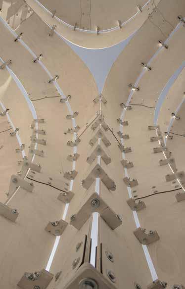 The choice to employ the active-bend methodology as the primary approach was based on its inherent simplicity in manufacturing planar components, which are subsequently shaped into curved elements during the assembly process. Additional benefits include ease of transportation and assembly, as well as enhanced structural performance and adaptability. Moreover, by applying elastic deformation, the approach enabled a cost-effective construction for the intricate architecture of the Cavilion.